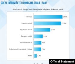 O odnosima Srbije i Amerike najveći broj građana informiše se preko televizije (29 odsto), gde preovlađuju sugrađani stariji od 60 godina, dok su mladi (18-29) ređe zainteresovani za to u odnosu na sve ostale. Nešto više od četvrtine ovu temu prati putem internet portala (27 odsto), što češće čine muškarci i oni uzrasta 45-59 godina, sa višim stepenom obrazovanja, iz urbanih sredina i mahom iz regiona Istočne i Južne Srbije