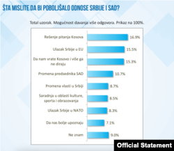 Građani Srbije, pokazuje istraživanje, smatraju da bi odnose Amerike i Srbije najpre popravilo rešenje pitanja Kosova (17 odsto), zatim ulazak Srbije u EU (16 odsto), kao i povratak Kosova u nadležnost Srbije (15 odsto).