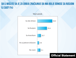 Skoro polovina građana (46 osto) smatra da je za Srbiju značajno da ima dobre odnose i sa Rusijom, i sa Amerikom. Odnosima sa Rusijom prednost je dalo najmanje ispitanika u poslednjih šest godina - 29 odsto (u odnosu na 45 odsto iz 2018.). Odnosima sa SAD pak, ovaj put prednost daje najveći procenat do sad - 11 odsto (u odnosu na samo pet odsto iz 2018), navode u IEP-u.