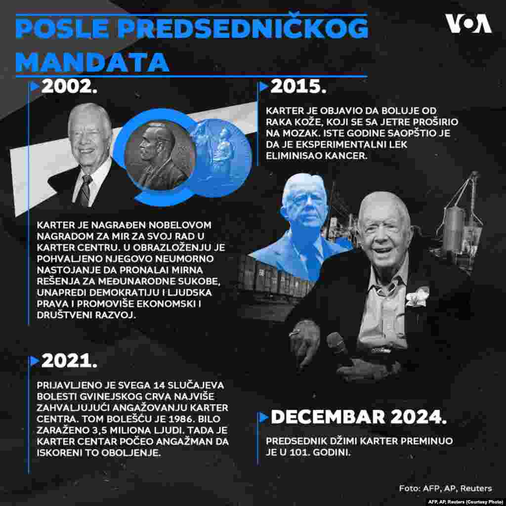 Bivši američki predsednik Džimi Karter, koji je u nedelju preminuo u 101. godini, biće sahranjen uz najviše državne počasti 9. januara. Tog dana biće proglašen i nacionalni dan žalosti, dok će zastave na državnim institucijama biti mesec dana spuštene na pola koplja u čast preminulog predsednika. Karter je bio najdugovečniji američki šef države – koji je u oktobru 2024. proslavio stoti rođendan. ◽Kako je tekao njegov životni put?