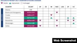 Prvi put u istoriji izveštaja “Nacije u tranziciji”, od Centralne Evrope do Evroazije je došlo do veće konsolidacije autoritarnih režima nego konsolidacije demokratije, kaže za Glas Amerike Nejt Šenkan iz Fridom Hausa. Demokratski razvoj na celom Balkanu je već nekoliko godina unazad u padu, a u ovogodišnjem izveštaju najveći je zabeležen u Makedoniji, Srbiji i Bosni i Hercegovini.