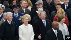 Bivši predsednik Džordž W. Buš sa suprugom Lorom, bivša državna sekretarka Hilari Klinton i bivši predsednik Bil Klinton čekaju početak 58. predsedničke inauguracije.