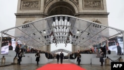 "Živeo mir, živele slobodne zemlje, živela Francuska", poručio je francuski predsednik na jraju svoj govora, nakon čega je položio venac i zapalio plamen kod Spomenika neznanom junaku.